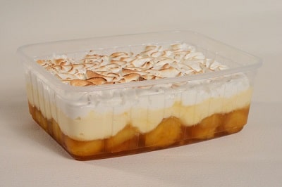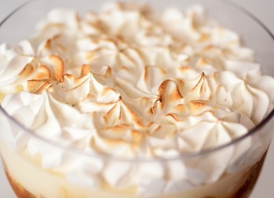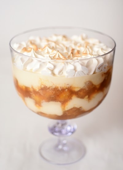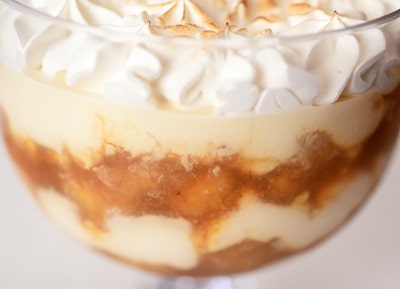 Bananas caramelizadas, creme de leite condensado e marshmallow dourado.