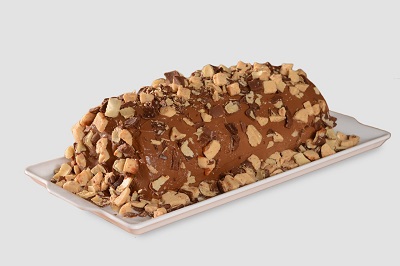 Bolo de chocolate recheado com creme de leite condensado e bombom, cobertura de brigadeiro e bombons.
