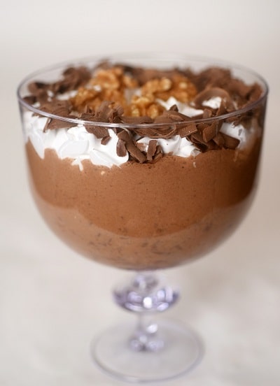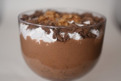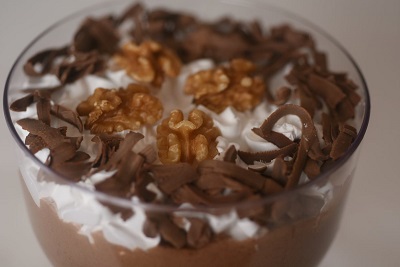 Creme de chocolate com nozes, raspas de chocolate e chantilly.