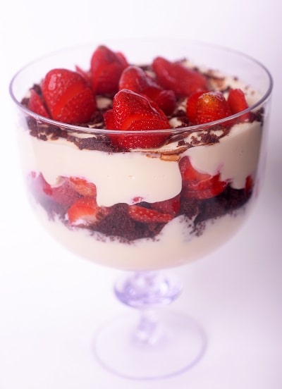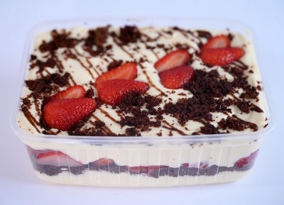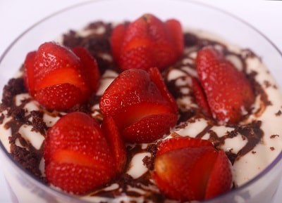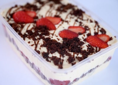 Creme de leite condensado, brownie, calda de chocolate e morango.