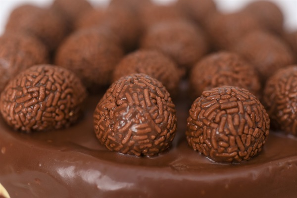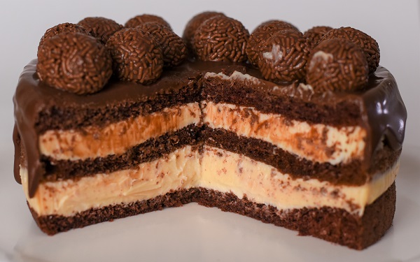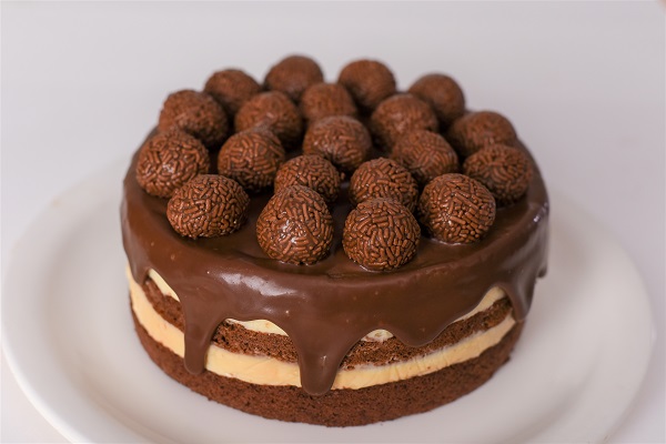 Bolo de chocolate recheado com brigadeiro, coberto com ganache e brigadeiros.