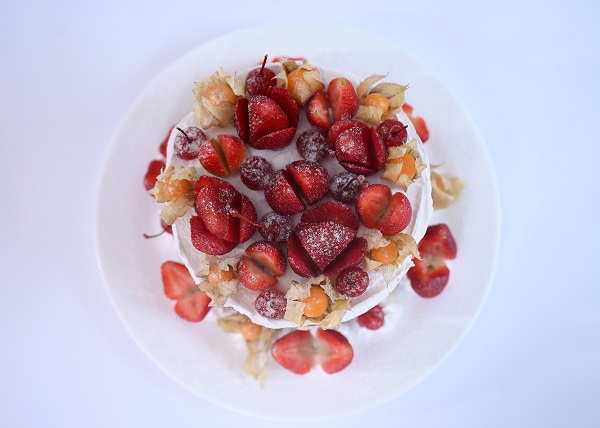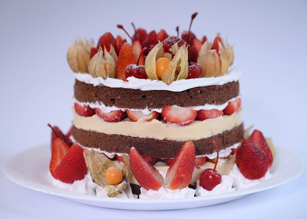 Bolo de chocolate recheado com creme de leite condensado, chantilly e morangos. Cobertura de chantilly, morangos, phisalys e cerejas.