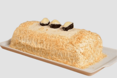 Bolo branco recheado com creme de leite condensado, ameixa e coco. Cobertura de chantilly de doce de leite e coco em flocos.