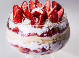 Creme de coco, suspiro, morango, chantilly e coco flocos.