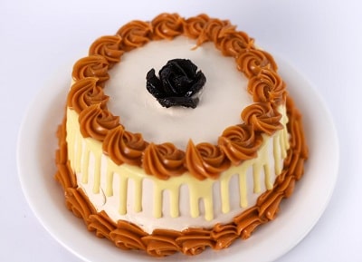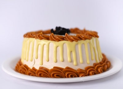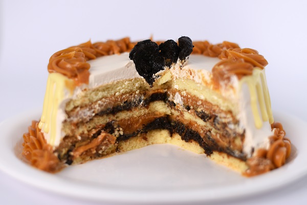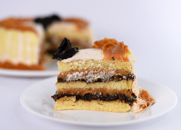 Bolo branco recheado com doce de leite e ameixa, coberto com chantilly de doce de leite.
