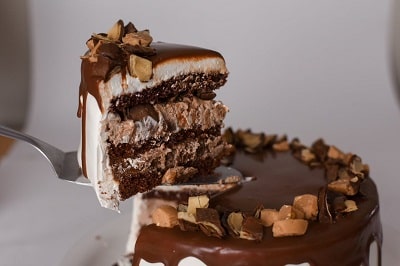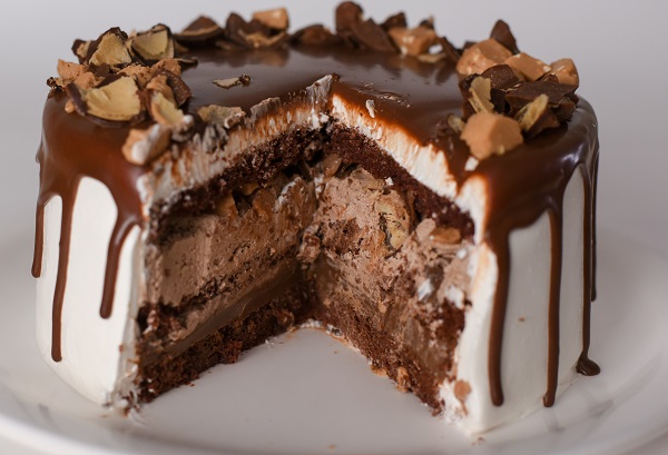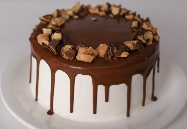 Bolo de Chocolate recheado com brigadeiro, musse de chocolate e bombons. Cobertura de musse marfim, ganache e bombons.