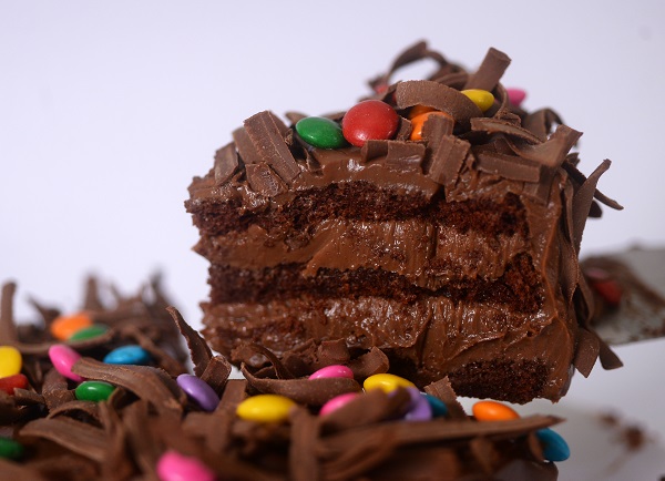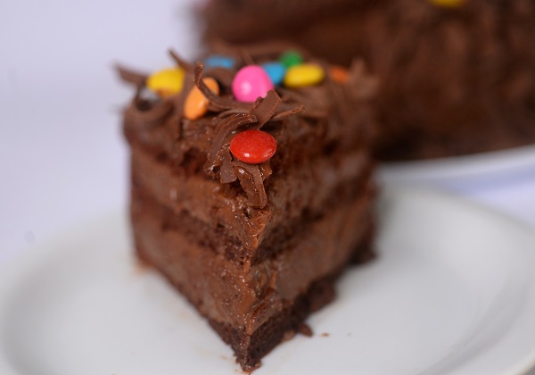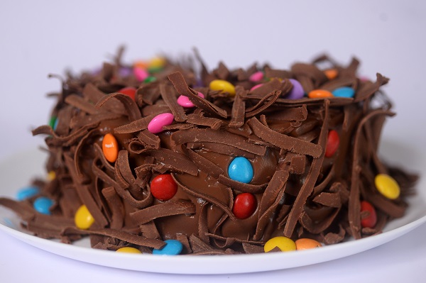 Bolo de chocolate recheado com brigadeiro. Cobertura de brigadeiro, lascas de chocolate ao leite e confetes.