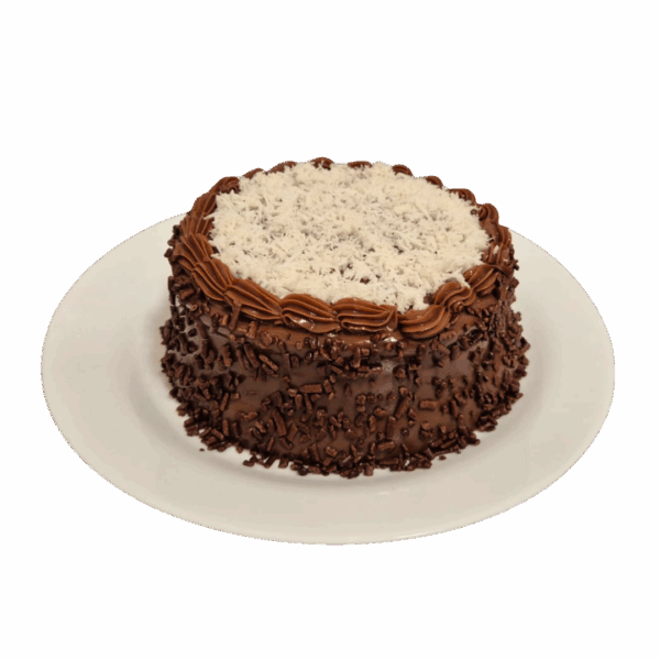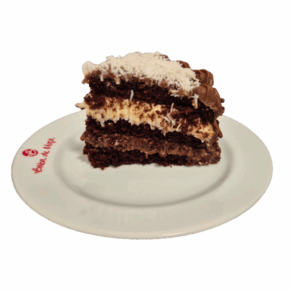 Bolo especial de chocolate recheado com creme de leite condensado, coco em flocos e brigadeiro. Cobertura de brigadeiro, lascas de chocolate ao leite e coco em flocos.