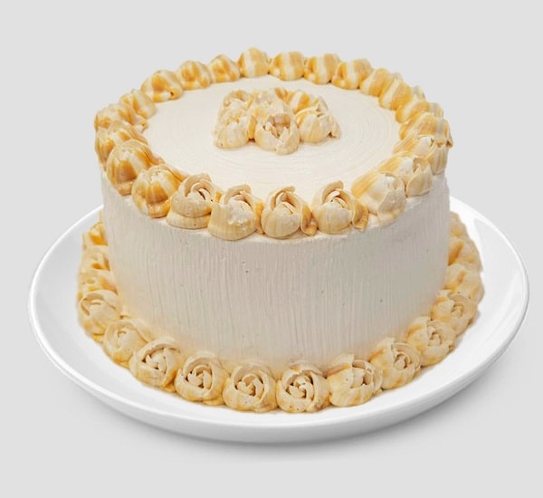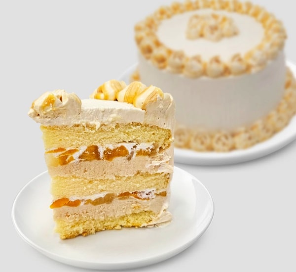 Bolo branco recheado com creme de leite condensado, abacaxi, pêssego e creme de leite. Cobertura de musse marfim, abacaxi, pêssego e cereja.