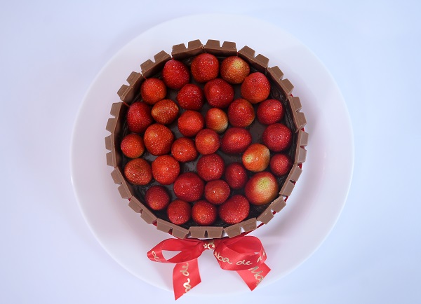 Bolo de chocolate recheado com creme de leite condensado e brigadeiro. Cobertura de brigadeiro, kit kat e confetes (ou morangos).