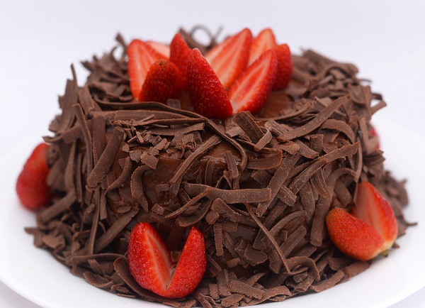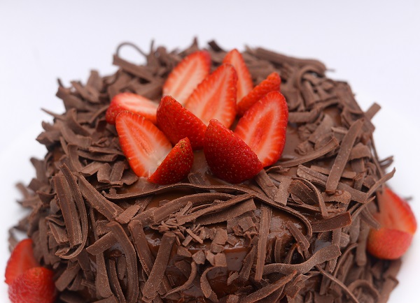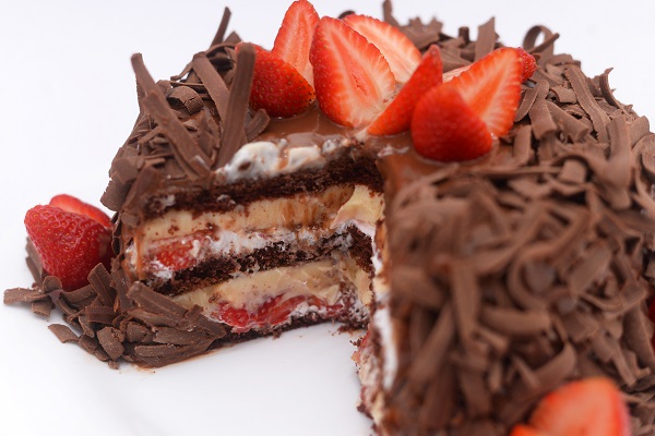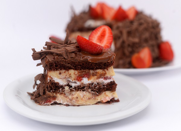 Bolo de chocolate recheado com creme de leite condensado, chantilly e morangos. Cobertura de brigadeiro, lascas de chocolate ao leite e morangos.