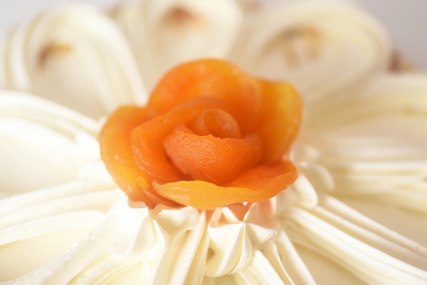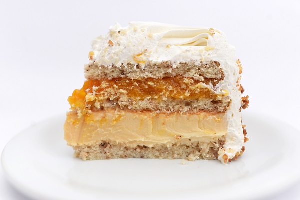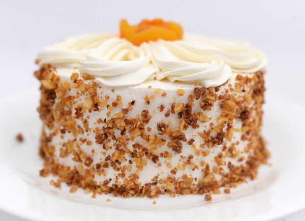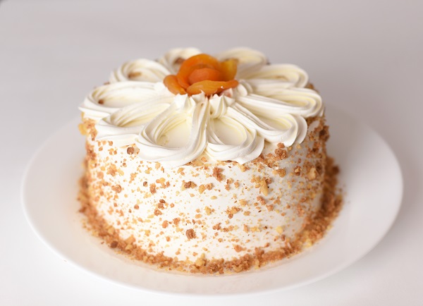 Bolo de nozes recheado com creme de leite condensado e creme de damasco. Cobertura de musse marfim, crocante de nozes e damasco.