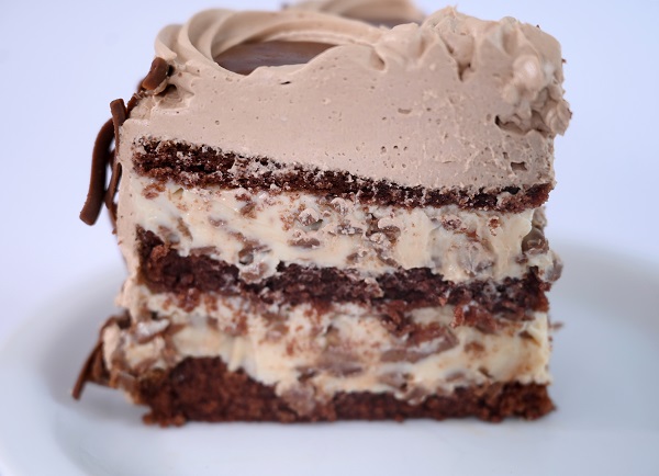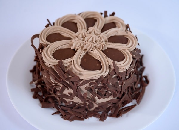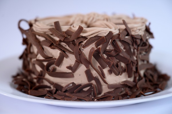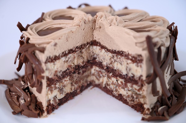 Bolo de chocolate recheado com creme de quatro leites e lascas de chocolate ao leite. Cobertura de musse de chocolate, ganache e raspas de chocolate ao leite.